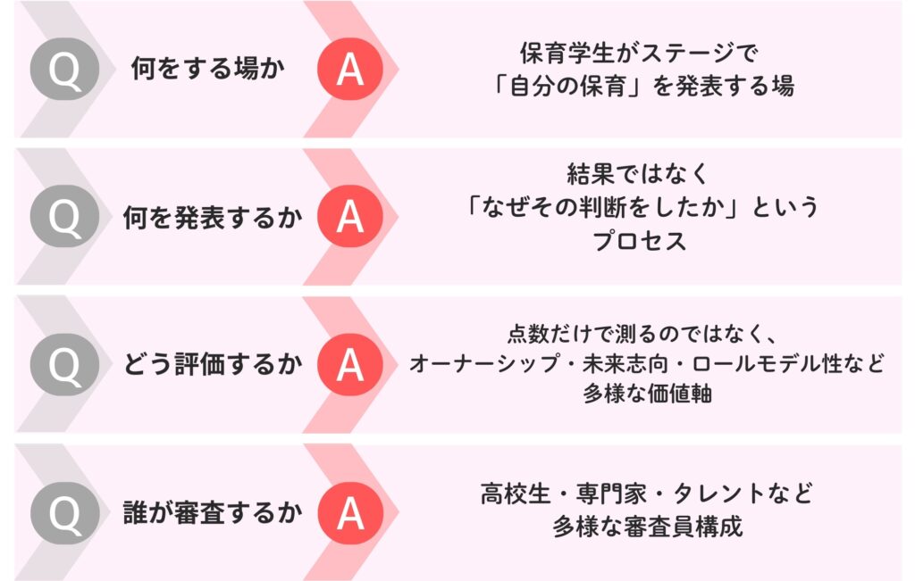 普通は専門家だけで評価するんですけど、あえて「保育をまだ知らない視点」を入れることで、社会への橋渡しになるんです。